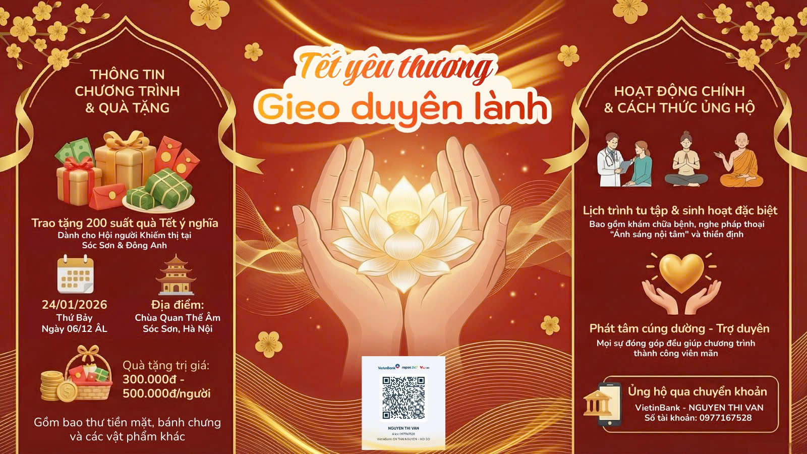 Mùa xuân lại về, mang theo hơi ấm của đất trời và niềm hy vọng mới. Trong khoảnh khắc thiêng liêng ấy, Chùa Quan Thế Âm xin được khởi duyên lành tổ chức **Chương trình Tết Yêu Thương – Phát quà Tết cho Hội Người Khiếm Thị Sóc Sơn và Đông Anh (cũ)**, kết hợp **Khóa Tu Một Ngày An Lạc** dành cho khoảng **200 hội viên**. Đây là cơ hội để chúng ta cùng nhau gieo trồng hạt giống từ bi, mang ánh sáng của tình người đến những mảnh đời còn nhiều thiệt thòi.